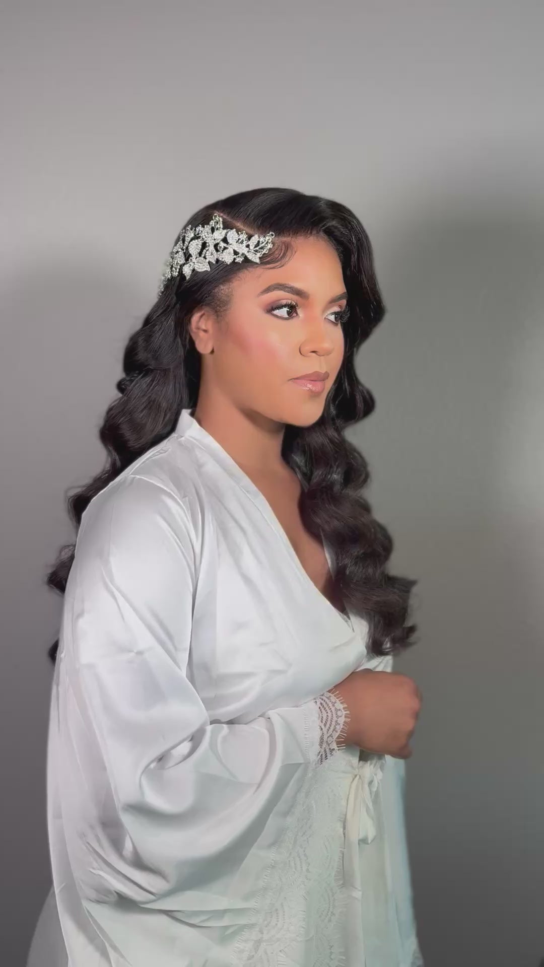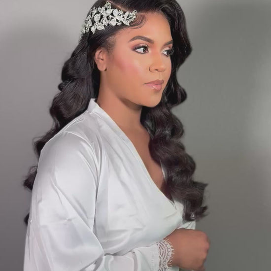 This radiant headpiece features three attached combs, making it versatile for side styles (updo or downstyle), as a headband, or elegantly wrapped around a stunning updo.